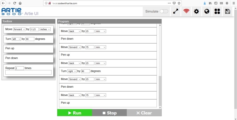 The Artie UI is very basic and easy to understand, and once mastered you can move up to Blockly and on through the other languages such as JavaScript, where you will be actually typing out code (a very useful skill to learn). We are using Artie UI and Blockly for now and are having great fun as well as interactive learning – from each program we write we can run it and see it draw on paper or can simulate it first to see how it will work, and then try to work how to fix any errors or make improvements. A great way to get the brain cells working with some logical thinking.